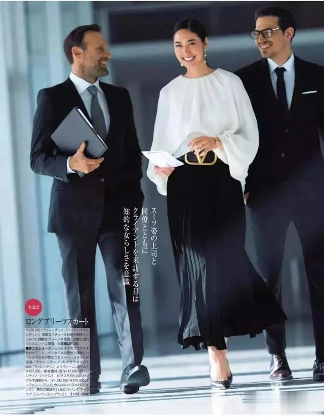 all black 的西装+百褶裙+黑皮鞋,有了百褶的存在就不会单调乏味,至于露出的白皙脚踝肌肤,也在暗暗地留白驱散暗淡老气▼